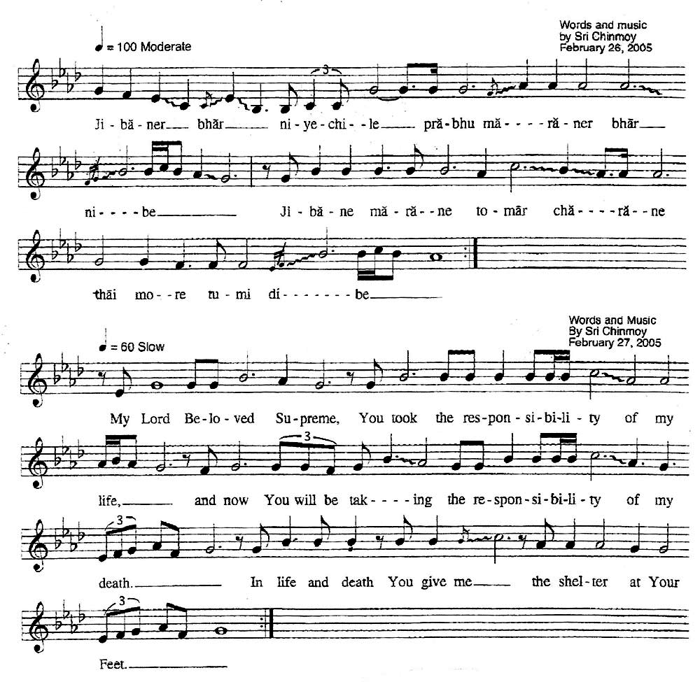 Guru: When somebody passes on from our spiritual family, I would like this particular song to be sung. This is not only for the disciples, but also for the disciples’ relatives – if they are totally in favour of your spiritual life. Tonight I will put a very, very, very, very strong, divine force – very, very, very strong – into the soul of the song. It will definitely, definitely, definitely help the soul of your dear one. I have composed it from my heart, but tonight I will add, add tremendous, tremendous, tremendous divine force into the song. If anybody leaves the earth from our spiritual family, then I will be very happy if you take it as compulsory.