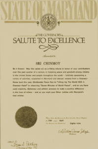 • April 13, 1989. Sri Chinmoy receives ‘The Governor’s Salute to Excellence’ the state’s highest individual honour from Gov. William Schaefer of MD.